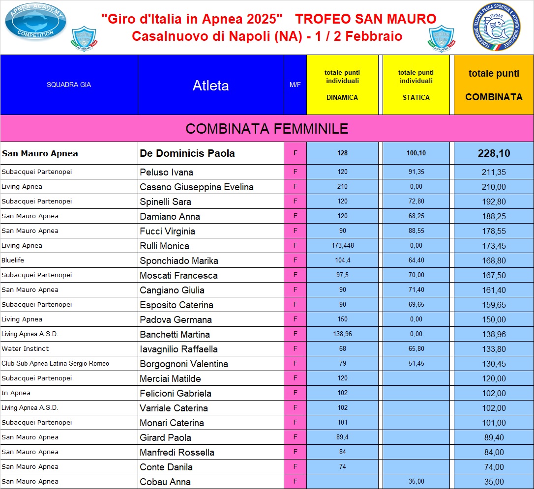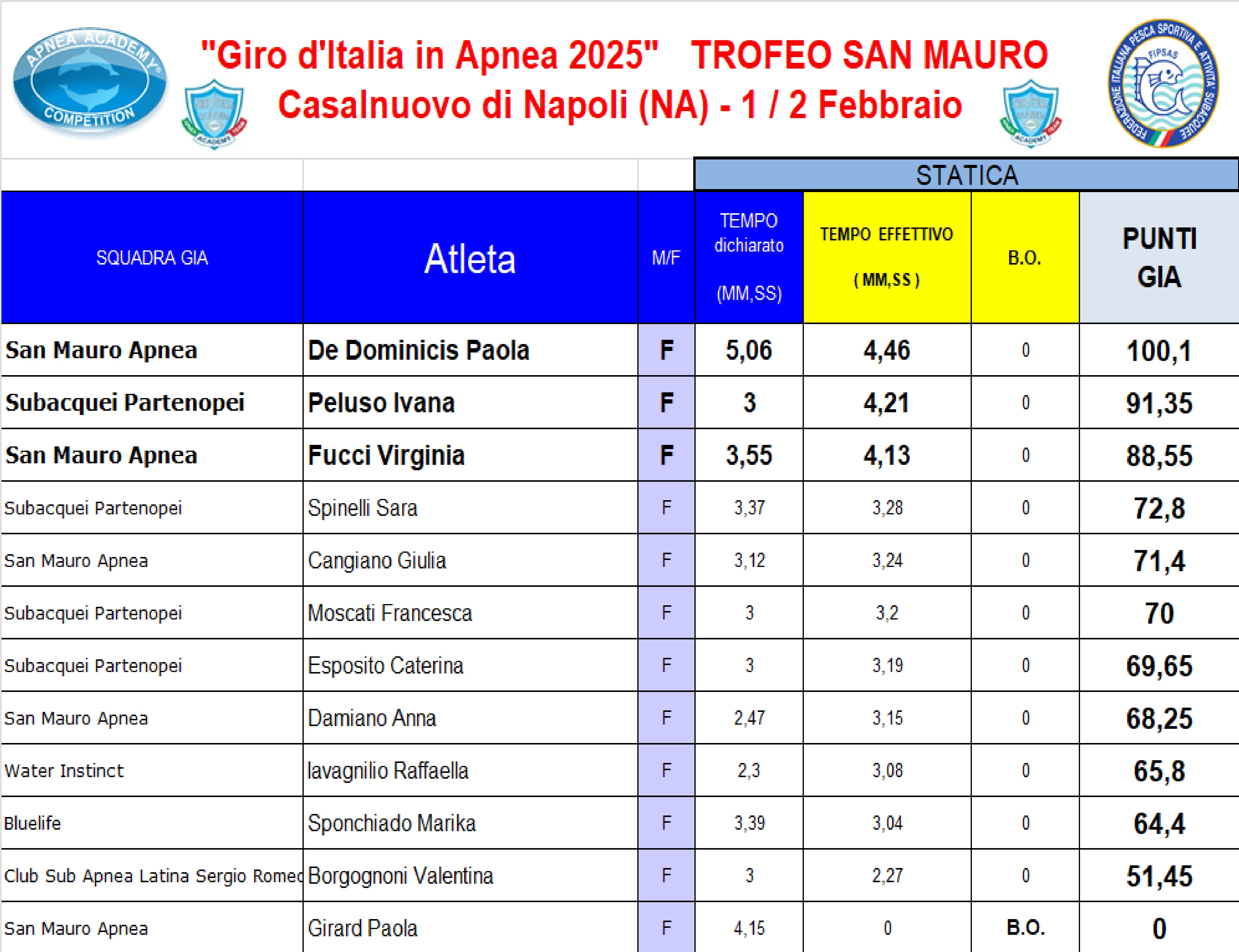 Dopo due tappe outdoor e cinque tappe indoor si conclude il Giro d’Italia in Apnea 2024, con la vittoria della squadra San Mauro Nuoto, seguita sul podio dall’altra squadra campana dei Subacquei Partenopei, mentre sul terzo gradino del podio del GIA 2024 sale la squadra romana Water Instinct.