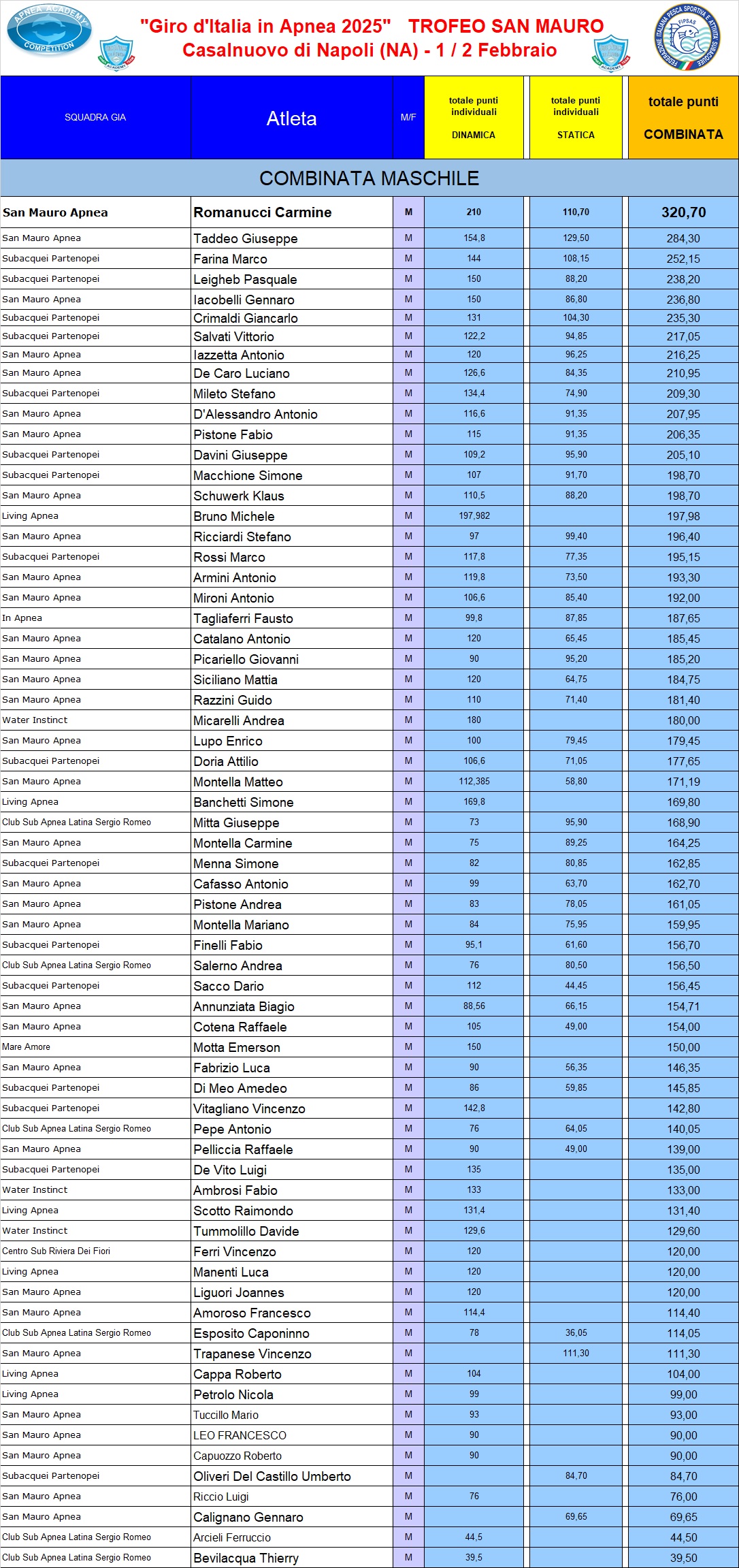 Statica maschile - Statica Femminile - Dinamica maschile - Dinamica Femminile - Combinata maschile - Combinata Femminile