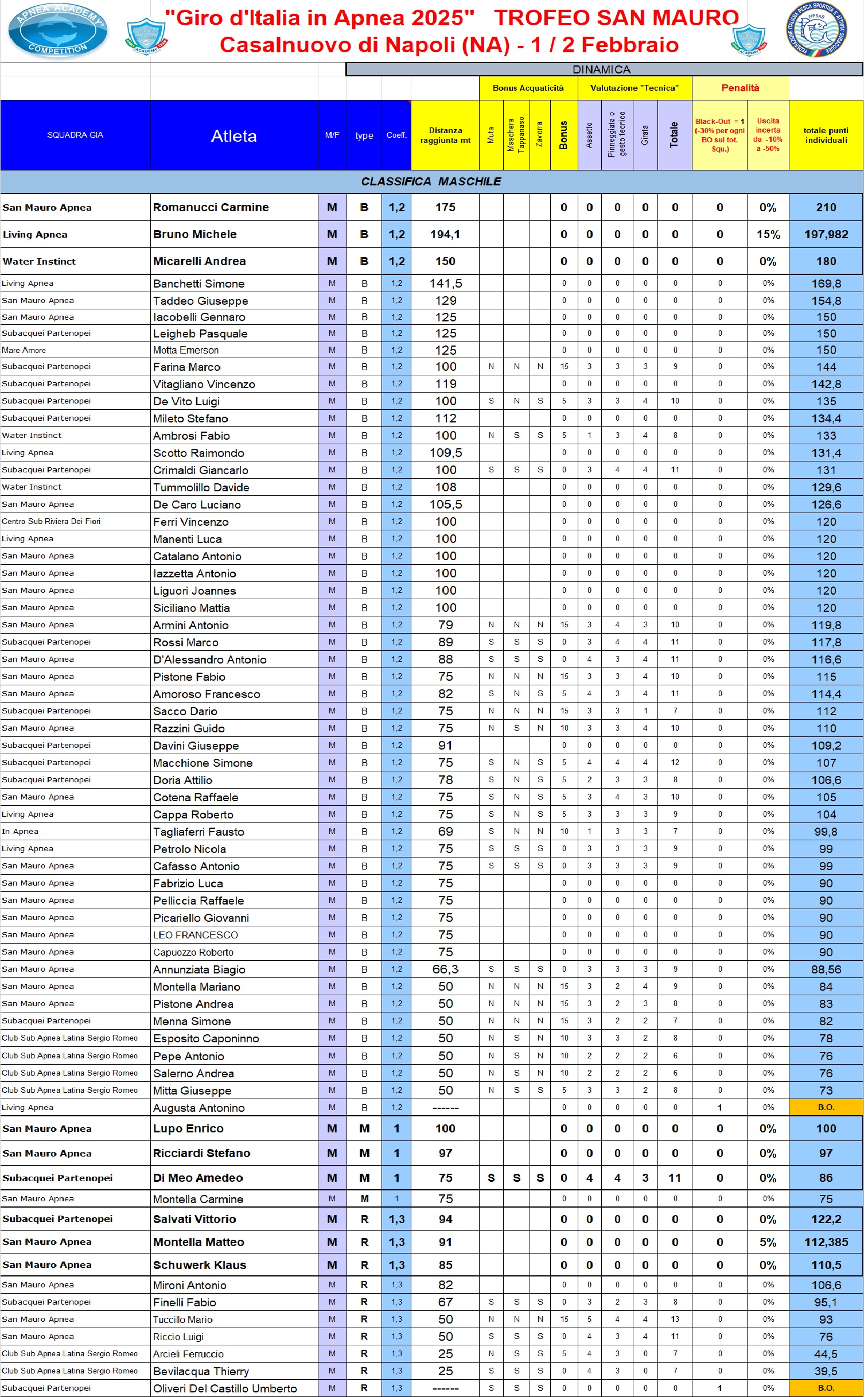 Un particolare ringraziamento va altresì a tutti gli istruttori AA che hanno contribuito all’organizzazione delle due tappe in mare, Marina di Camerota e Capri, supportate dal sistema di sicurezza unico al mondo, denominato Lulù (che consente il recupero dell’infortunato grazie ad un sistema autonomo di risalita rapida, monitorando l’intera prestazione, dalla superficie al piattello e ritorno) e dalla barca giuria della Capri-Freediving.